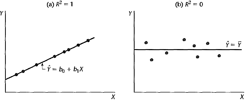 (a) \(\hat{y}_i = y_i\) and \(\small SS_{res} = \sum_{i=1}^n(y_i - \hat{y}_i)^2 = 0\). (b) \(\hat{y}_i = \overline{y}\) and \(\small SS_R = \sum_{i=1}^n(\hat{y}_i - \overline{y})^2 = 0\).