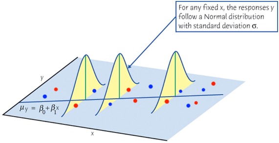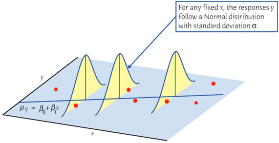 When we collect data \(\{ (x_1, y_1), (x_2, y_2), \dots, (x_n, y_n)\},\) \(y\) is assumed drawn from a normal distribution. Its value varies around its mean \(\mu_y\).