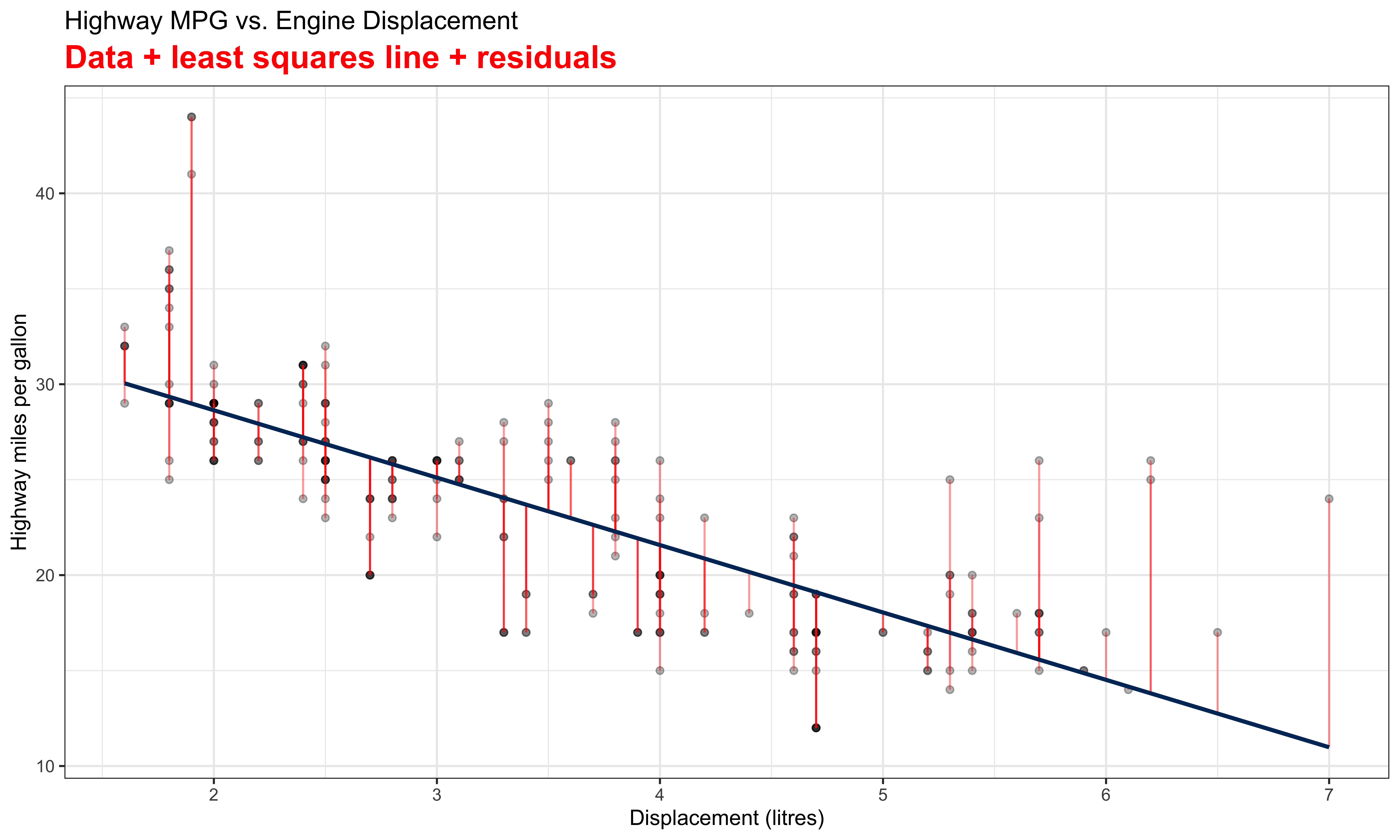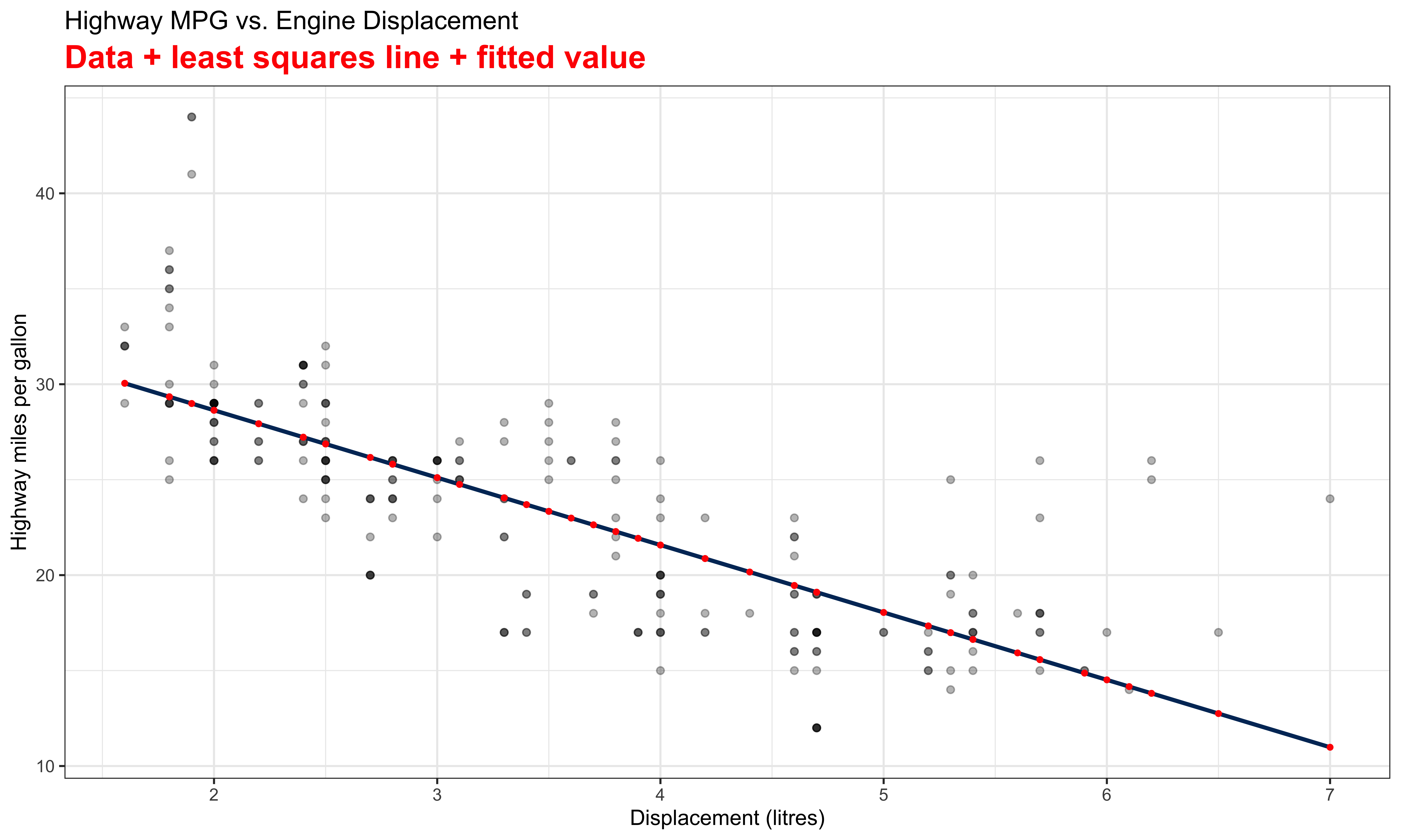 \(\widehat{hwy}_{i} = b_0 + b_1 \times displ_{i} = 35.698 -3.531 \times displ_{i}\)
