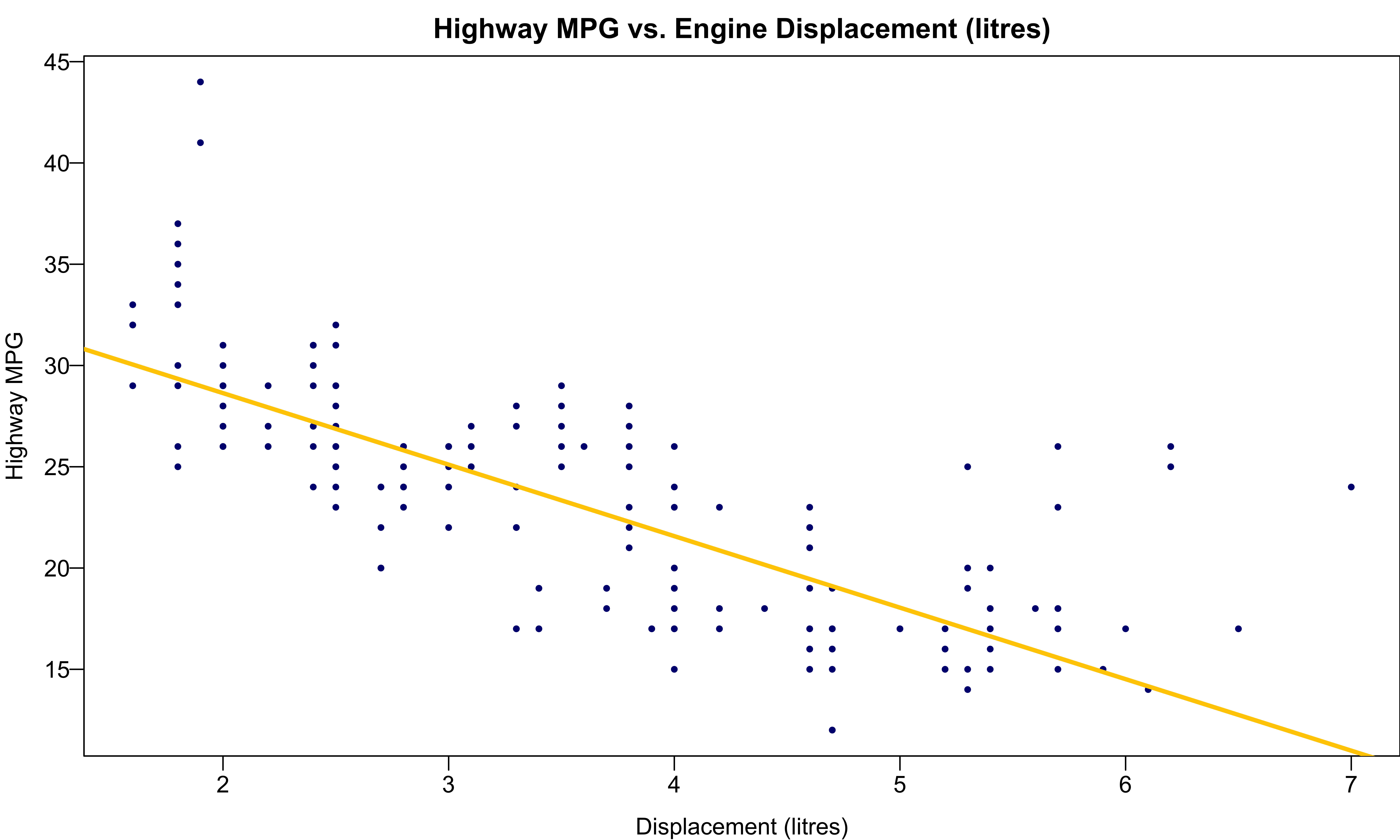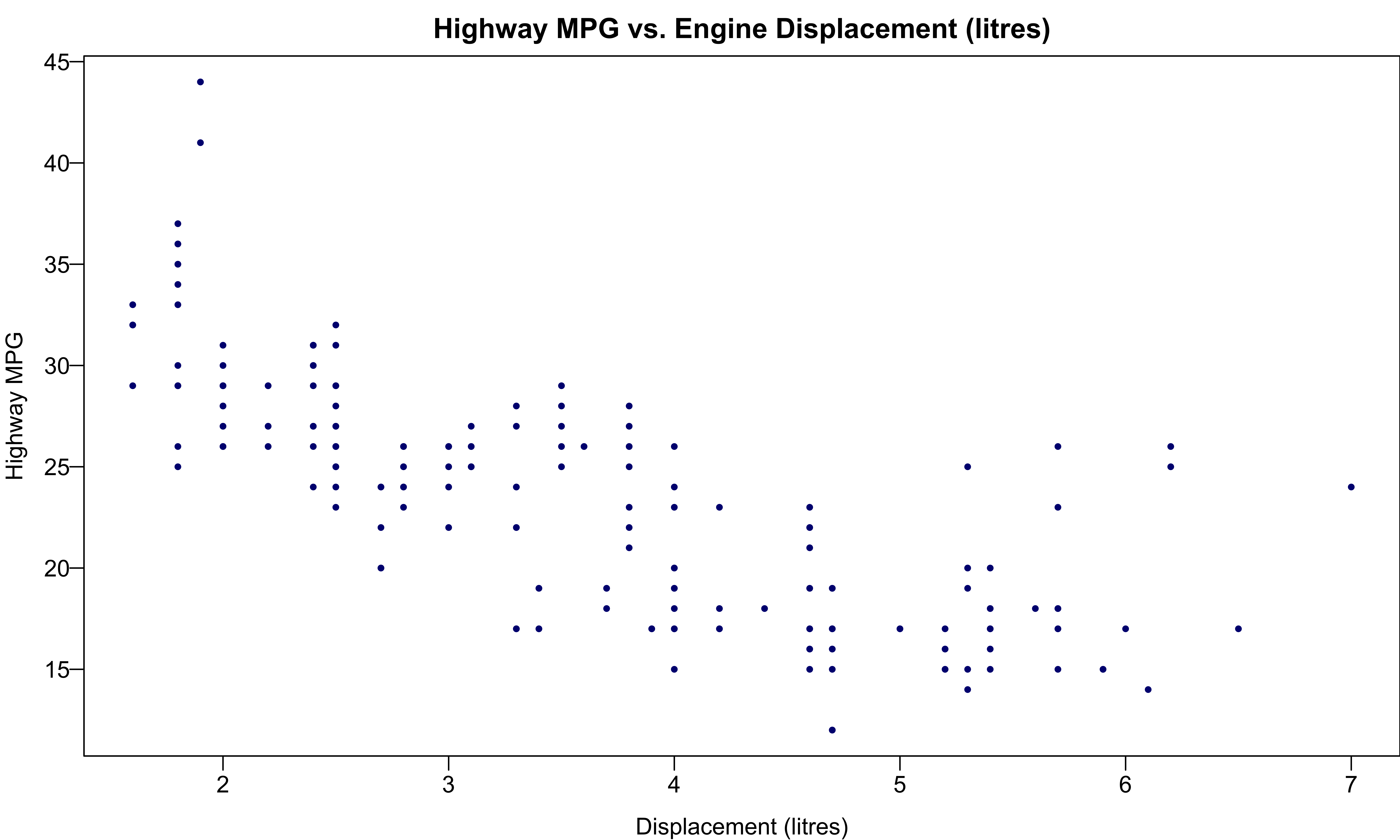 xlab = "Displacement (litres)", ylab = "Highway MPG",