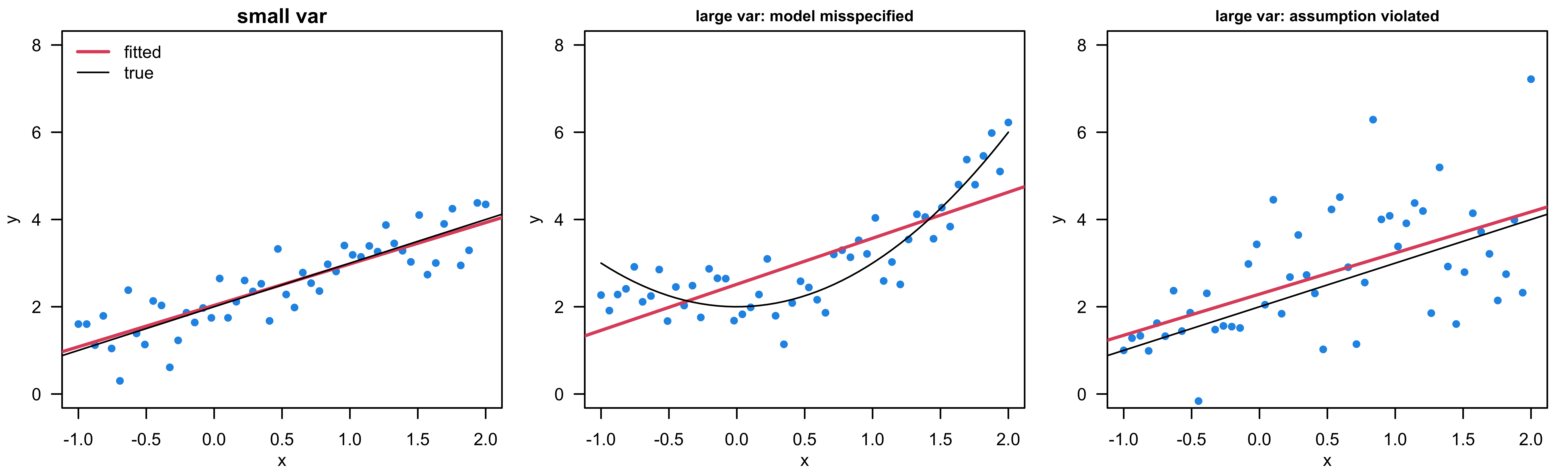 \[\begin{align*} \mathrm{Var}(Y_i \mid X_i) &= \mathrm{Var}(\beta_0 + \beta_1X_i + \epsilon_i) \\ &= \mathrm{Var}(\epsilon_i) = \sigma^2 \end{align*}\] The variance of \(Y\) does not depend on \(X\).
