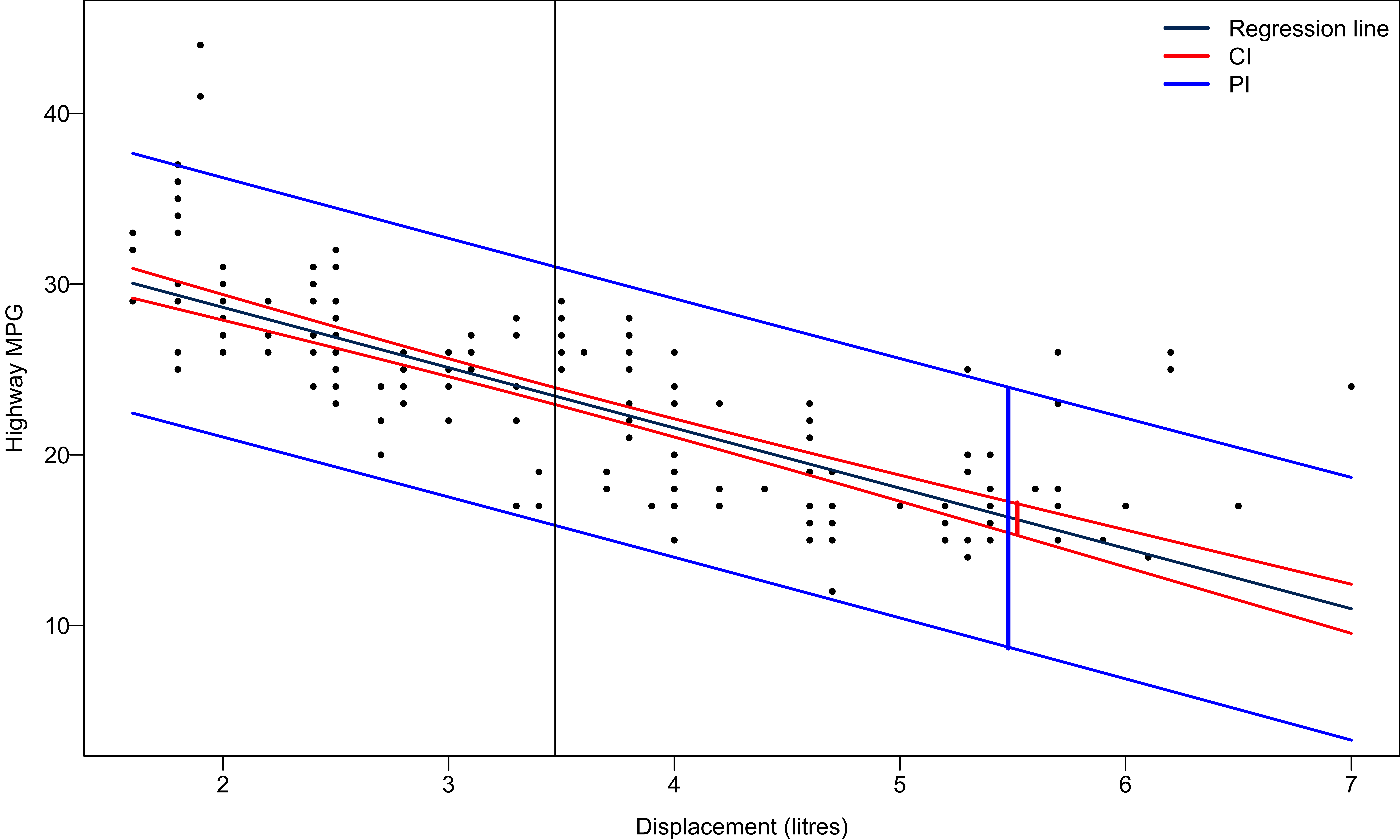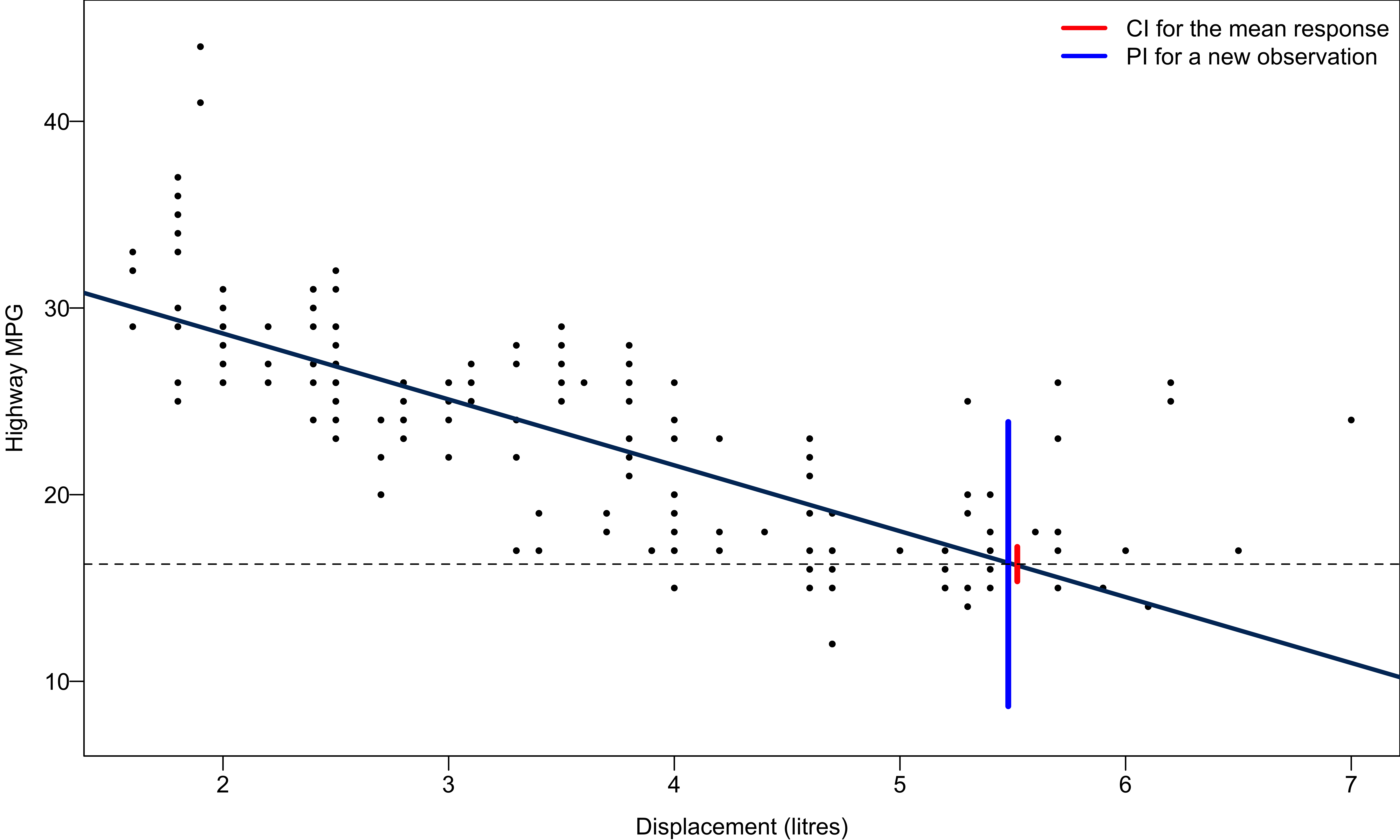 predict(reg_fit, newdata = data.frame(displ = 5.5), interval = "confidence", level = 0.95) fit lwr upr