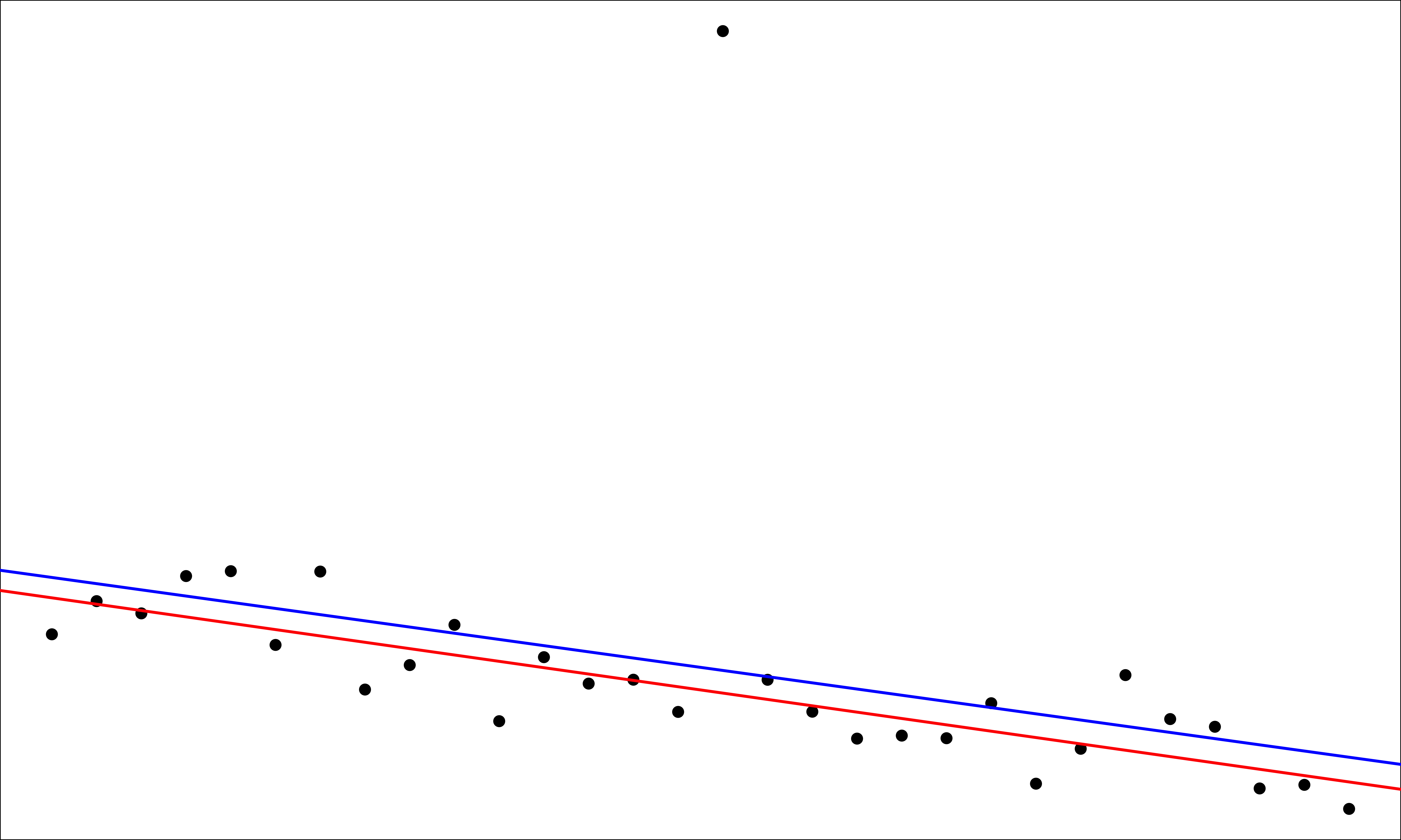\[\color{red}{b_1 = \frac{\sum_{i=1}^n(x_i - \overline{x})(y_i - \overline{y})}{\sum_{i=1}^n(x_i - \overline{x})^2} = \frac{S_{xy}}{S_{xx}} = r \frac{\sqrt{S_{yy}}}{\sqrt{S_{xx}}}},\] where \(S_{xx} = \sum_{i=1}^n(x_i - \overline{x})^2\), \(S_{yy} = \sum_{i=1}^n(y_i - \overline{y})^2\), \(S_{xy} = \sum_{i=1}^n(x_i - \overline{x})(y_i - \overline{y})\), and \(r\) is the sample correlation coefficient between \(x\) and \(y\).
