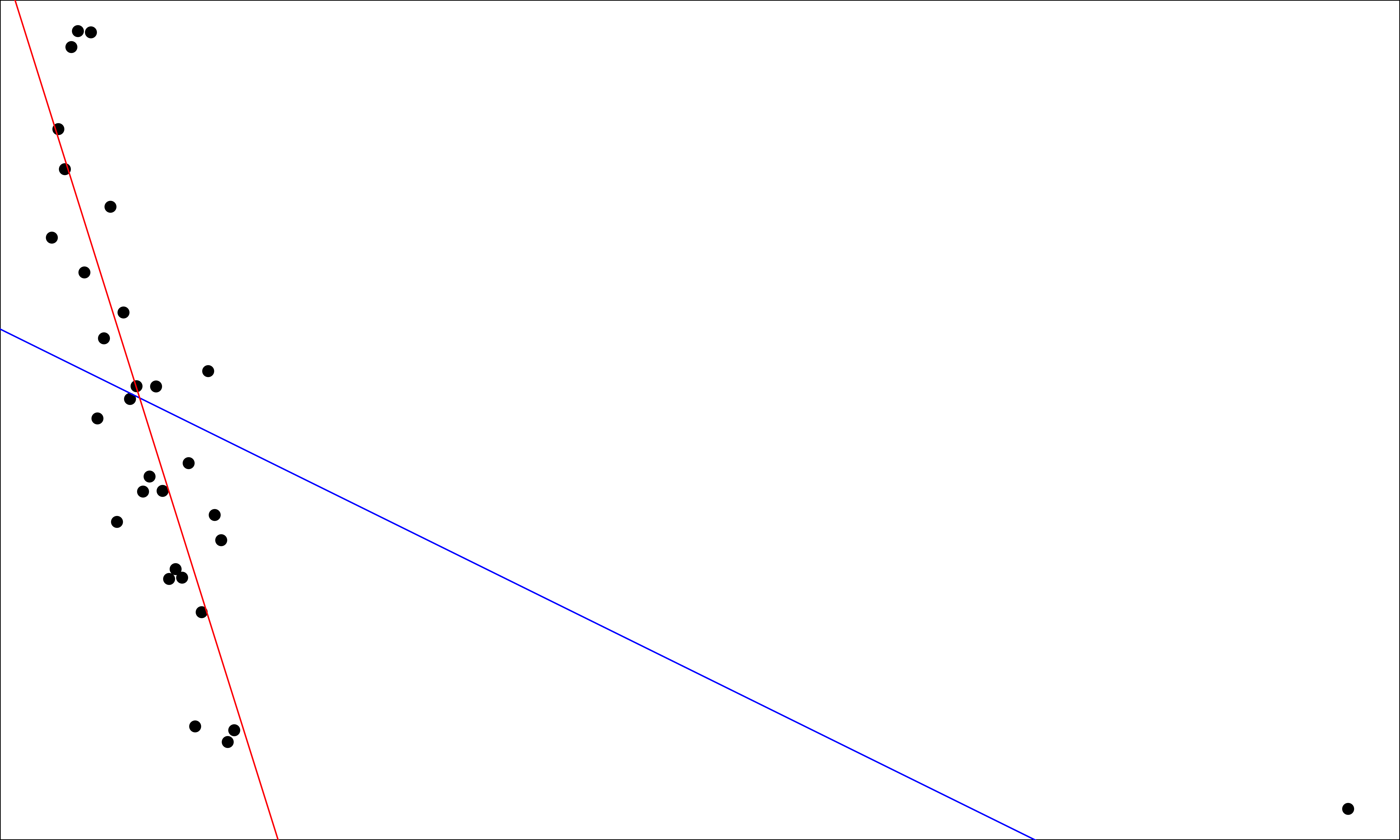 \[\begin{align} \hat{y}_i &= b_0 + b_1 ~x_i \\&= \overline{y} - b_1~\overline{x} + x_i\sum_{j=1}^n c_j y_j \\&= \cdots \\&= \sum_{j=1}^nh_{ij}y_j \\&= h_{i1}y_1 + h_{i2}y_2 + \cdots + h_{in}y_n\end{align}\] where \(h_{ij} = \frac{1}{n} + \frac{(x_i-\overline{x})(x_j-\overline{x})}{S_{xx}}.\)