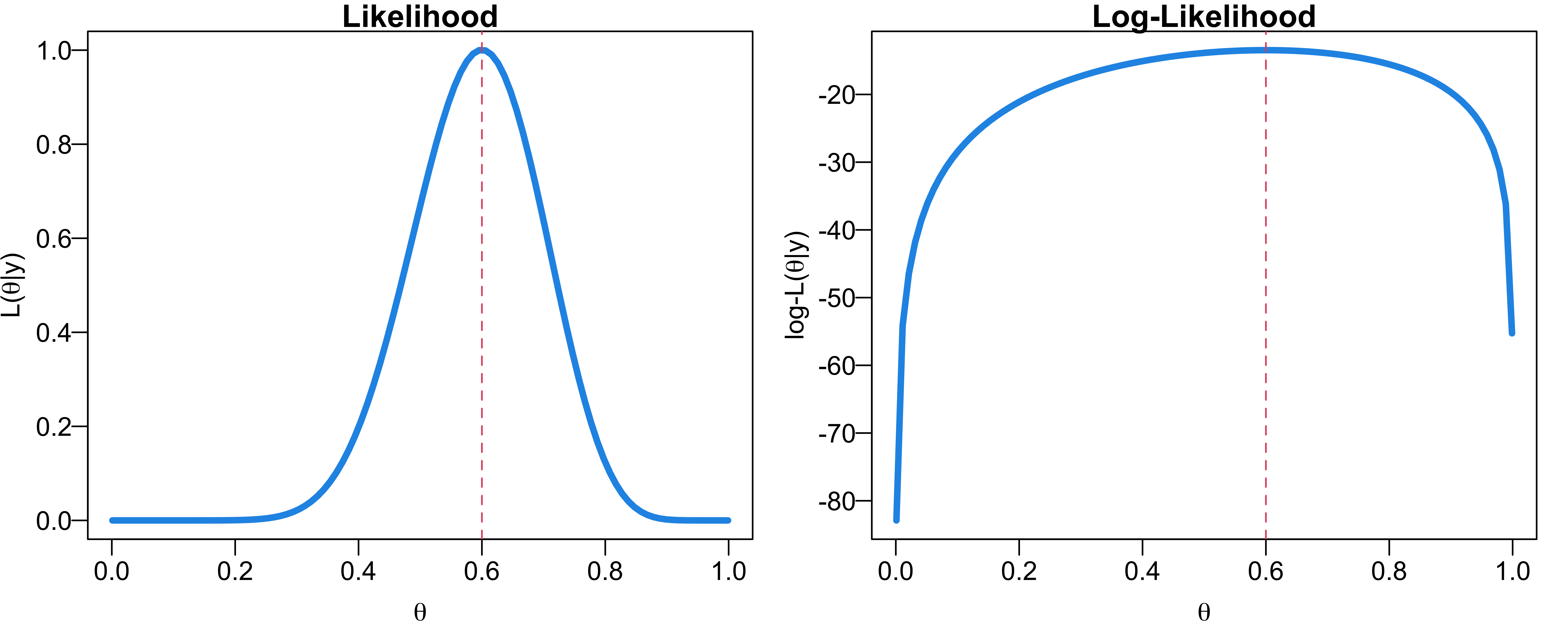 \[L(\theta) = \prod_{i = 1}^nf(y_i|\theta) = \prod_{i = 1}^n\theta^{y_i}(1-\theta)^{1-y_i} = \theta^{\sum_{i=1}^ny_i}(1-\theta)^{n-\sum_{i=1}^ny_i}\]