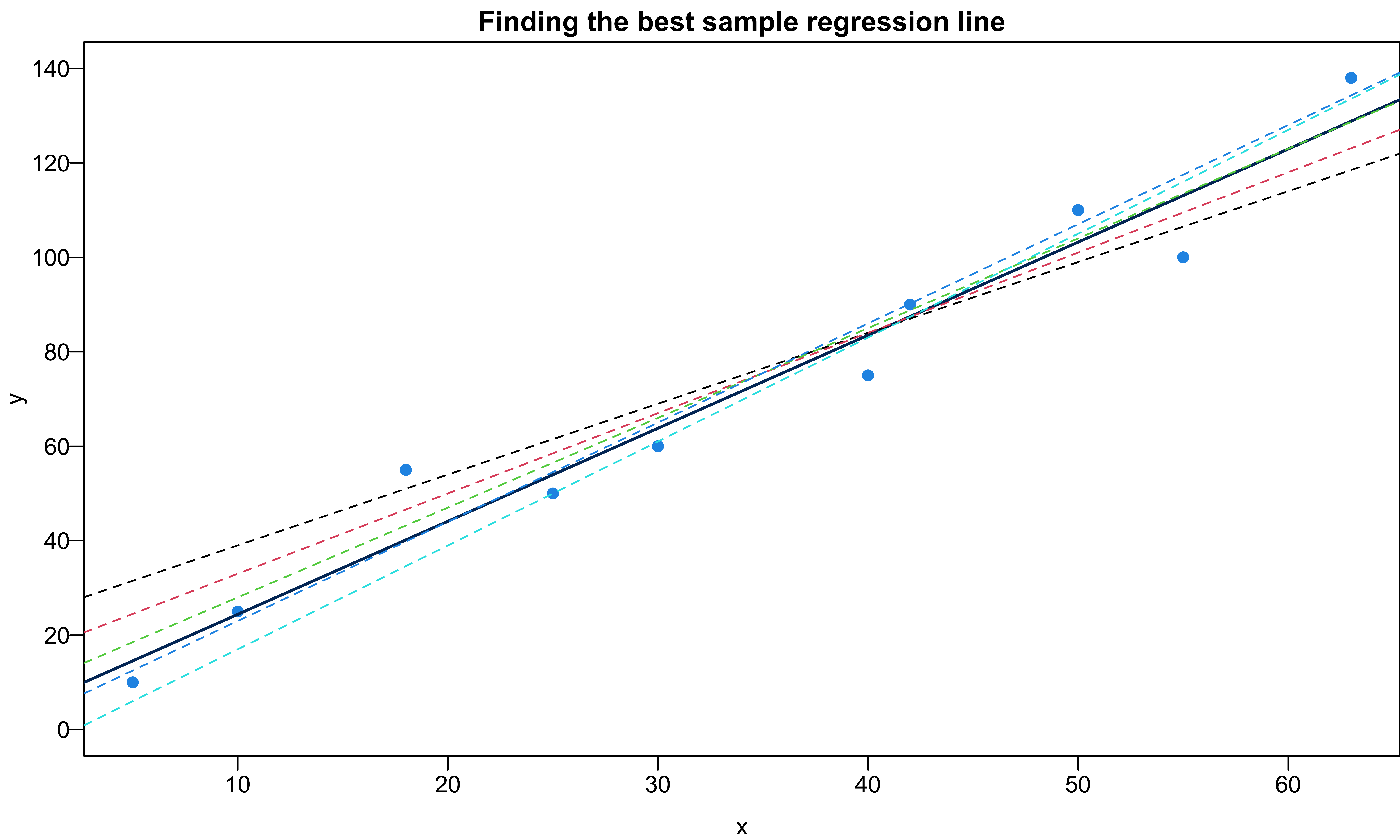 Choose the best \(b_0\) and \(b_1\) or the sample regression line minimizing the sum of squared residuals \[SS_{res} = e_1^2 + e_2^2 + \dots + e_n^2 = \sum_{i = 1}^n e_i^2.\]