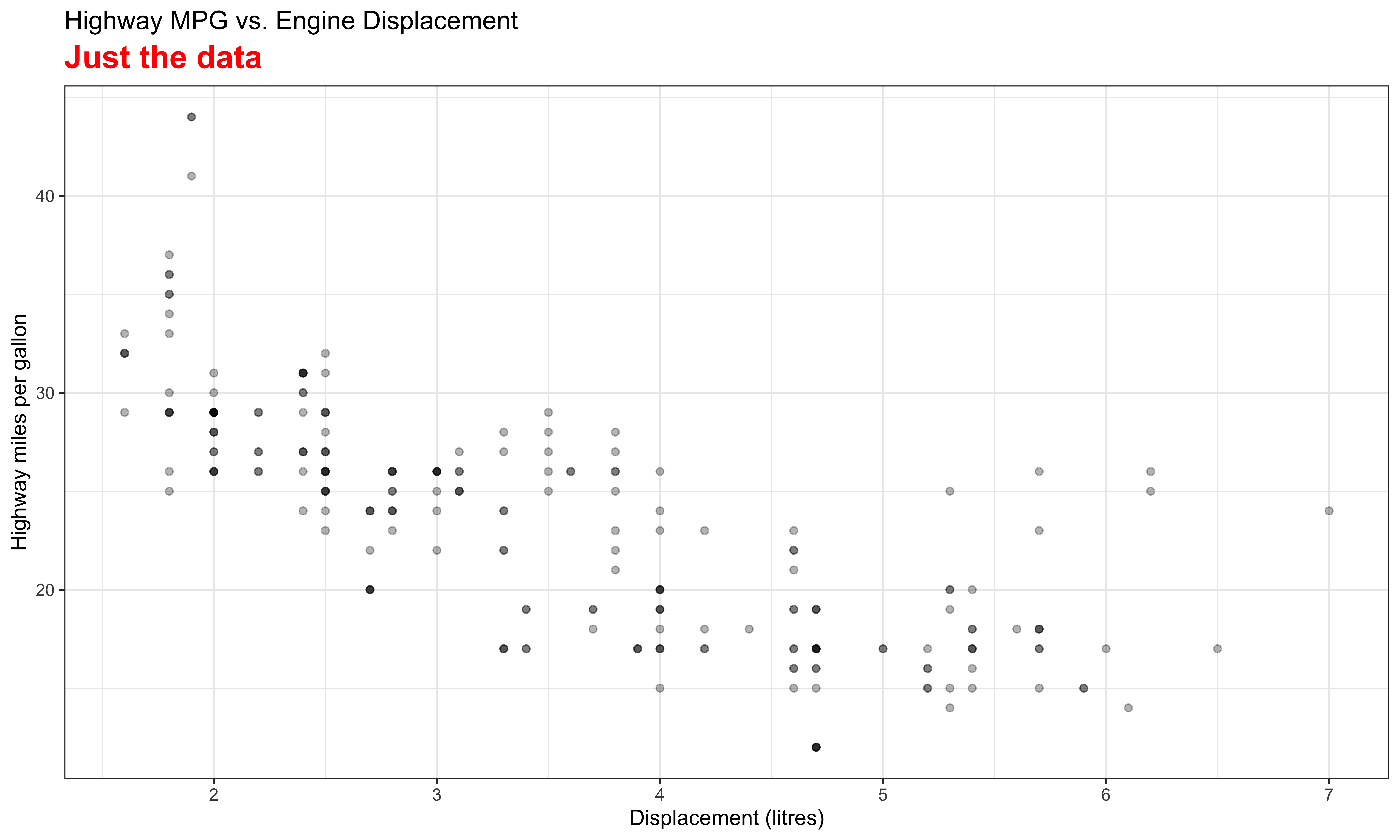 main = "Highway MPG vs. Engine Displacement (litres)")(reg_fit <- lm(formula = hwy ~ displ, data = mpg))