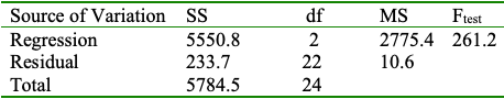 F-statistic: 261 on 2 and 22 DF, p-value: 4.69e-16