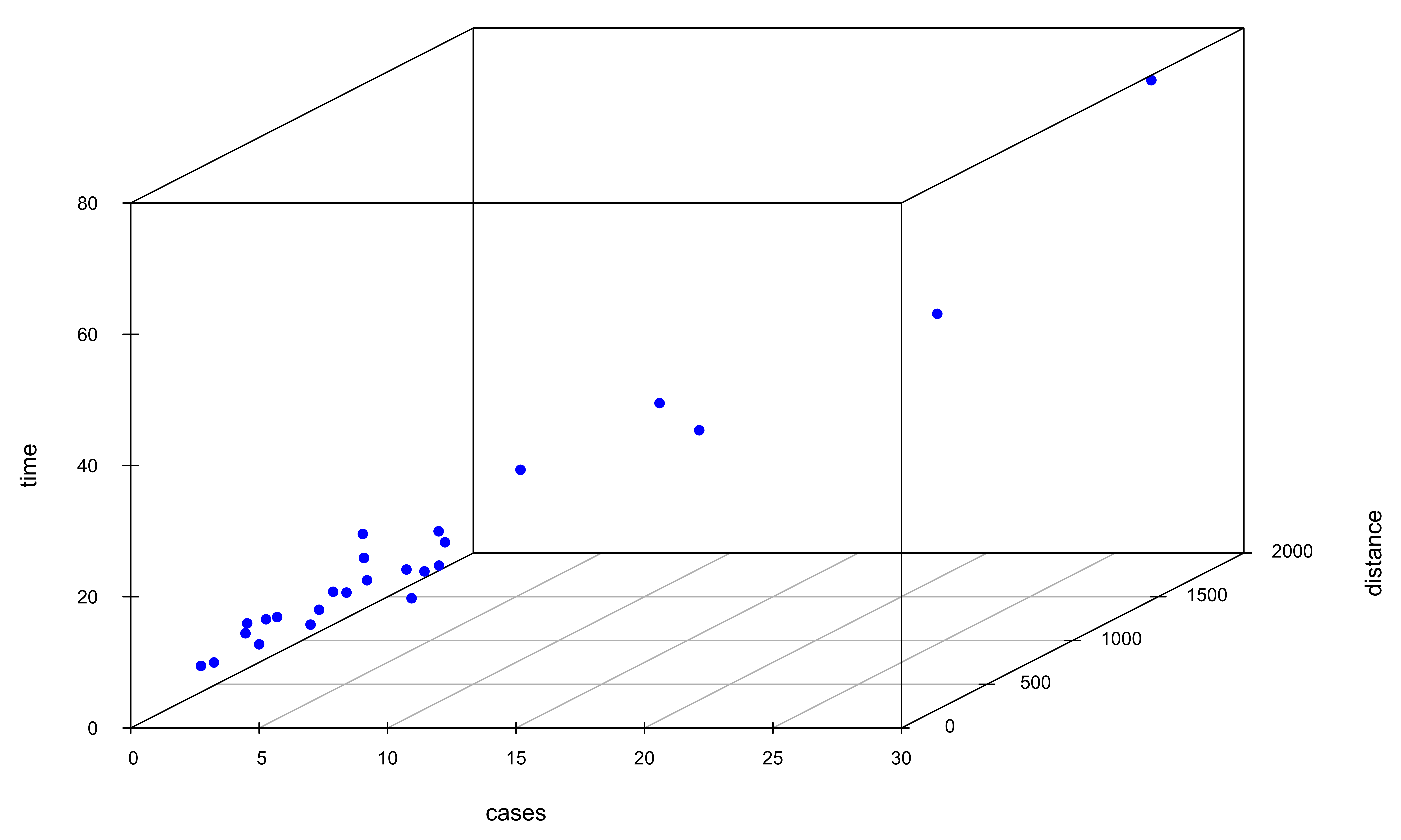 box = TRUE, color = "blue", mar = c(3, 3, 0, 2), angle = 30, pch = 16)delivery_lm <- lm(time ~ cases + distance, data = delivery_data)