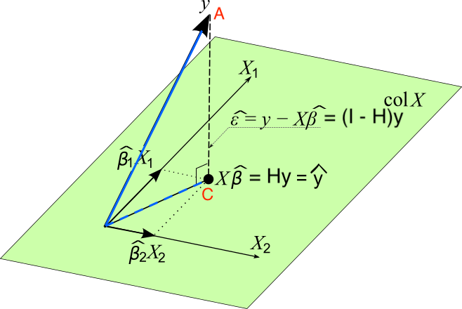 \[\hat{\bf y} = {\bf X} {\bf b} = {\bf X} ({\bf X}' {\bf X}) ^{-1} \bf X' \bf y = \bf H \bf y\]