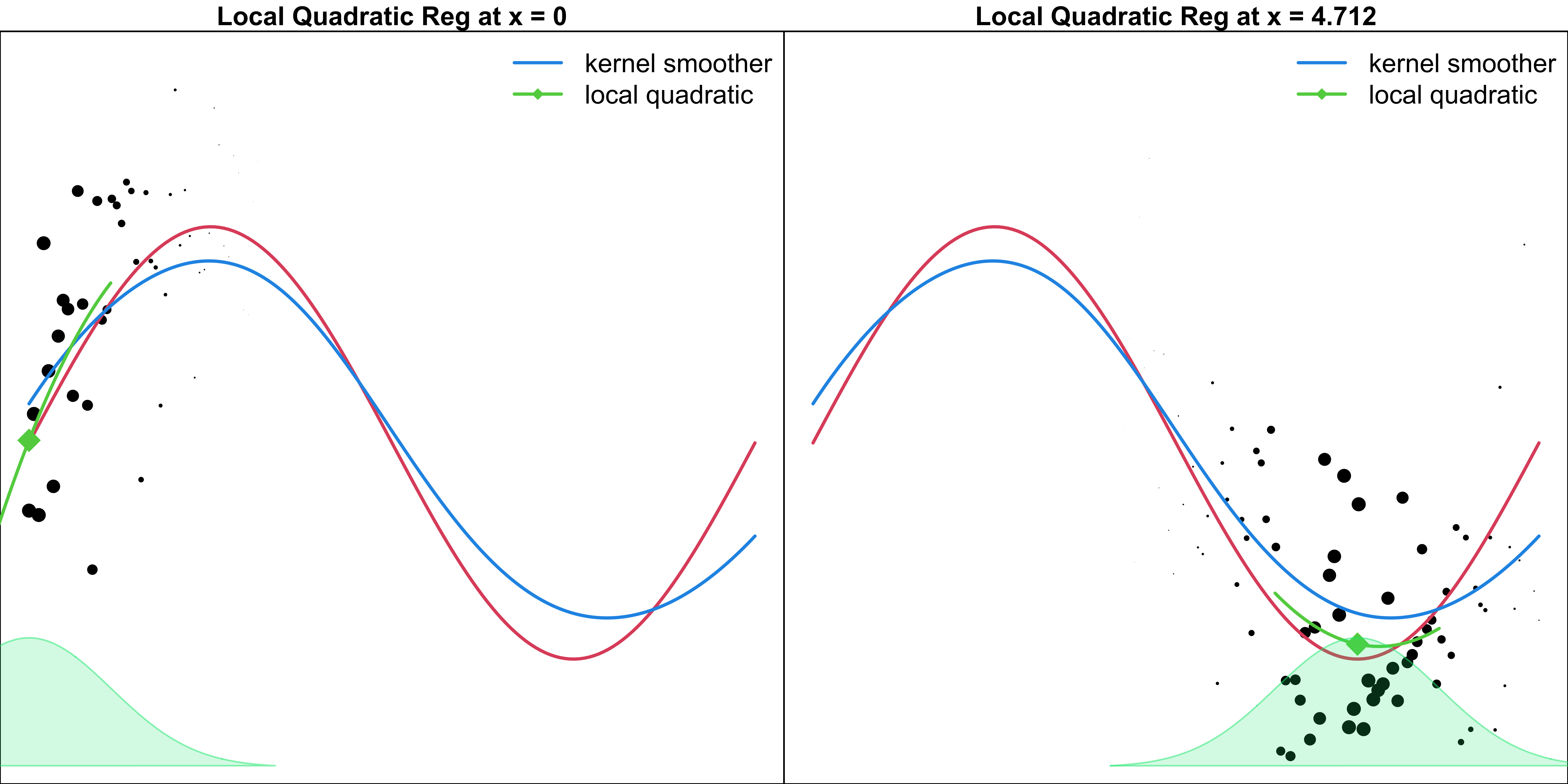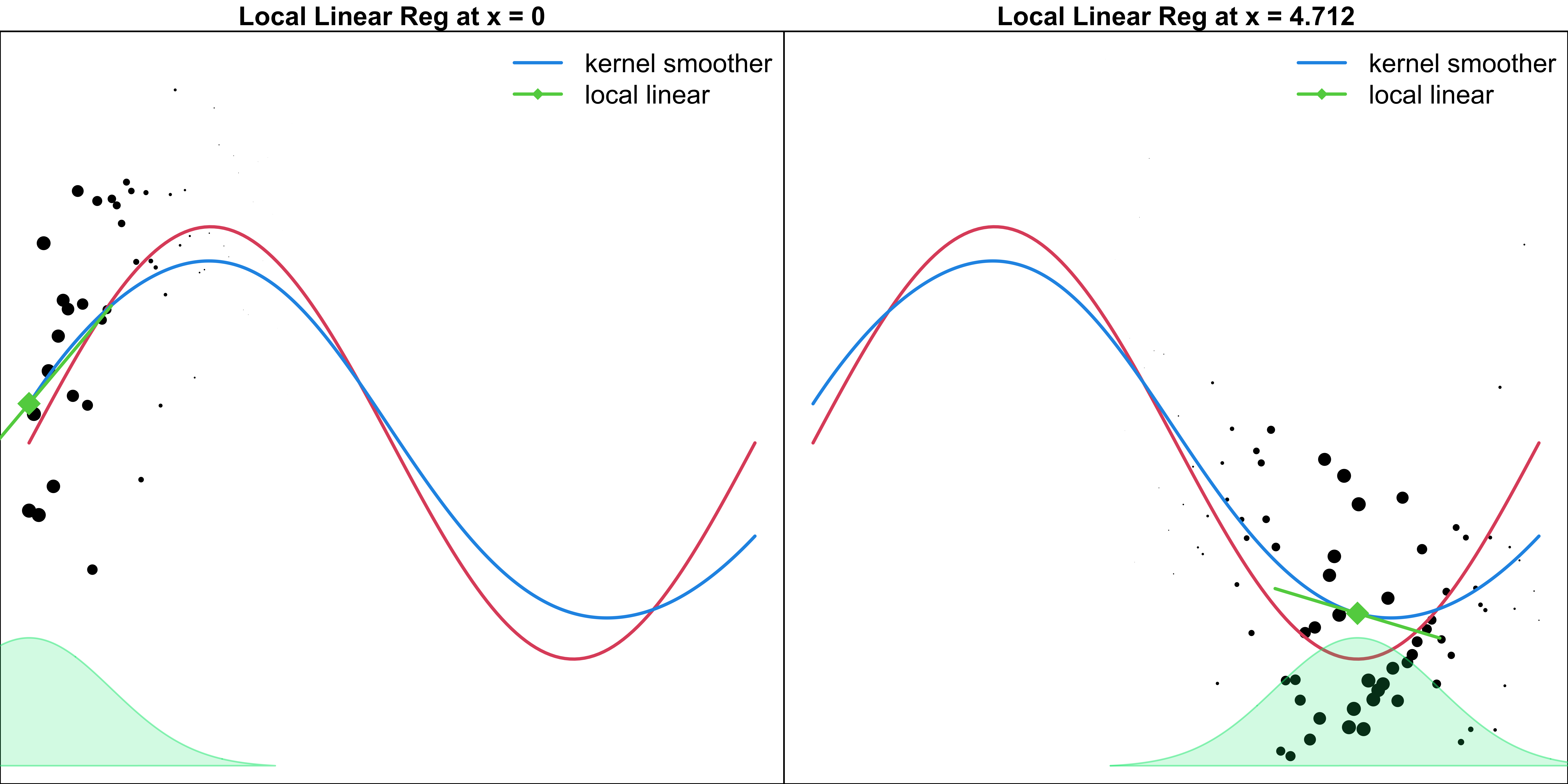 Find the estimates of \(\beta_0\) and \(\beta_1\) at \(x_0\) by minimizing \[\sum_{i=1}^nK_b(x_0, x_i)(y_i - \beta_0 - \beta_1x_i)^2\]