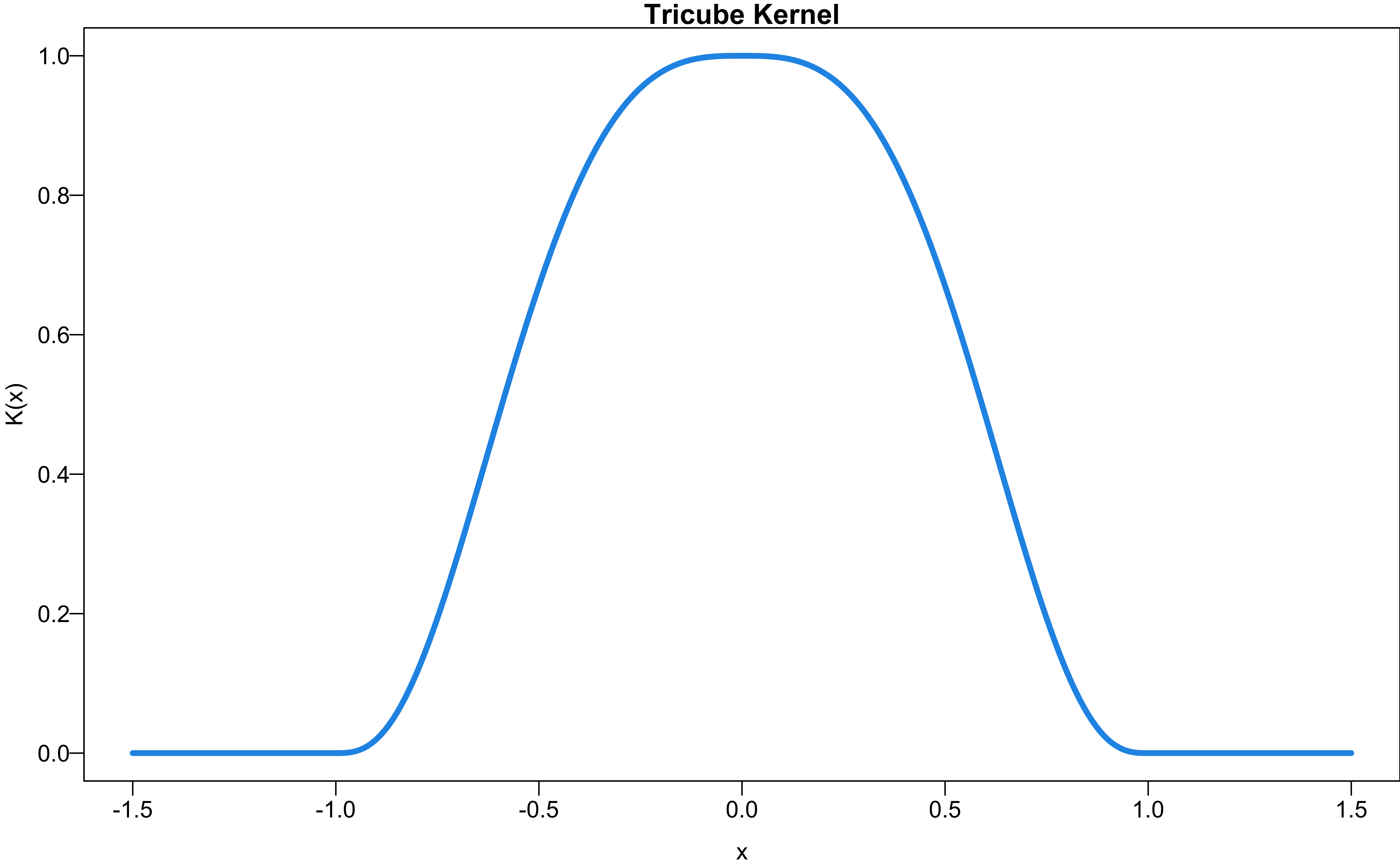 # deg: Degree of polynomial to use.LOESS (LOcally Estimated Scatterplot Smoothing) uses the tricube kernel \(K(x_0, x_i)\) defined as \[K\left( \frac{|x_0 - x_i|}{\max_{k \in N(x_0)} |x_0 - x_k|}\right)\] where \[K(t) = \begin{cases} (1-t^3)^3 & \quad \text{for } 0 \le t \le 1\\ 0 & \quad \text{otherwise } \end{cases}\]