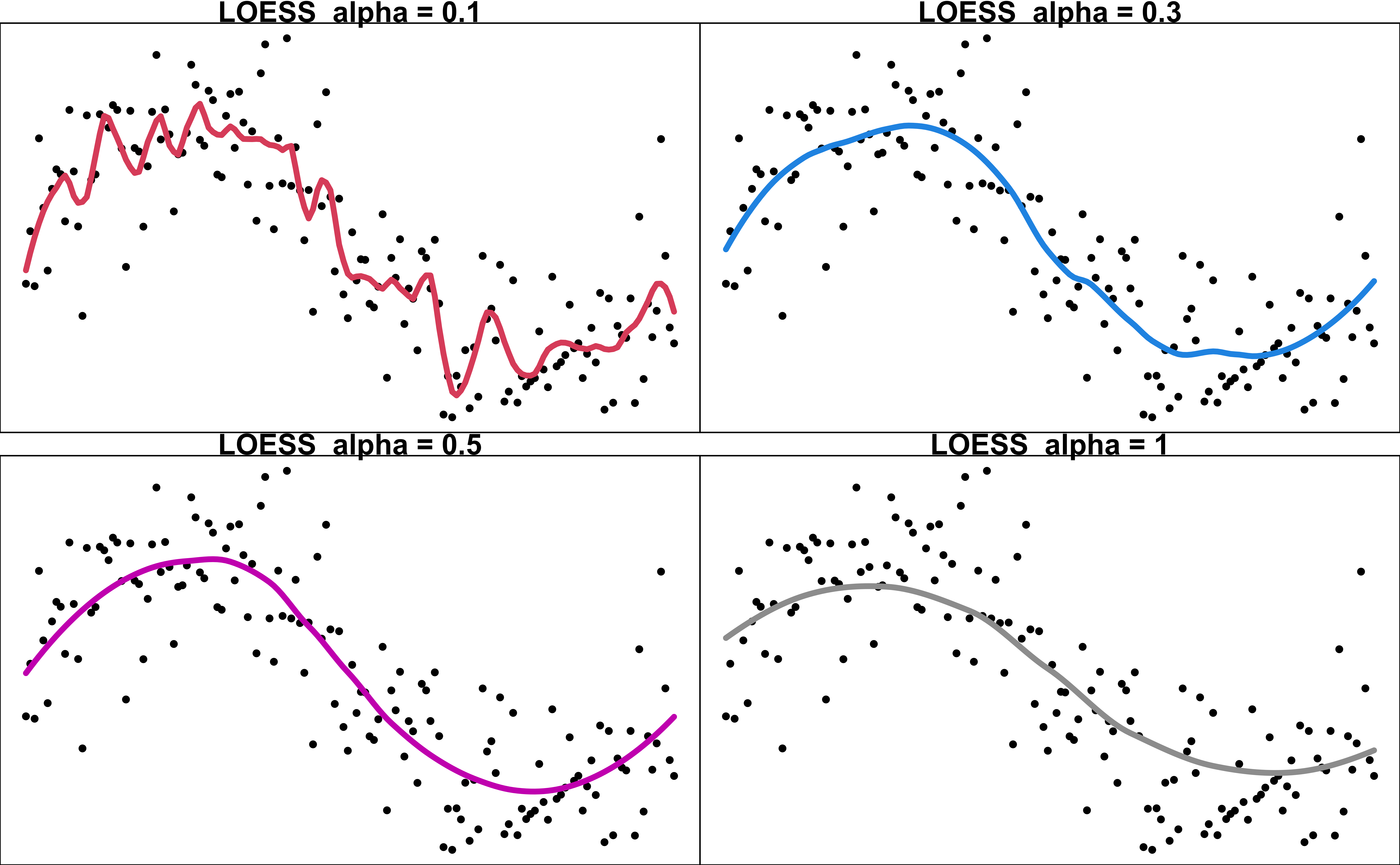 loess(y ~ x, span = 0.75, degree = 2) ## Default settingloess(), KernSmooth::locploy(), locfit::locfit(), ksmooth(). Not all of them uses the same definition of the bandwidth.