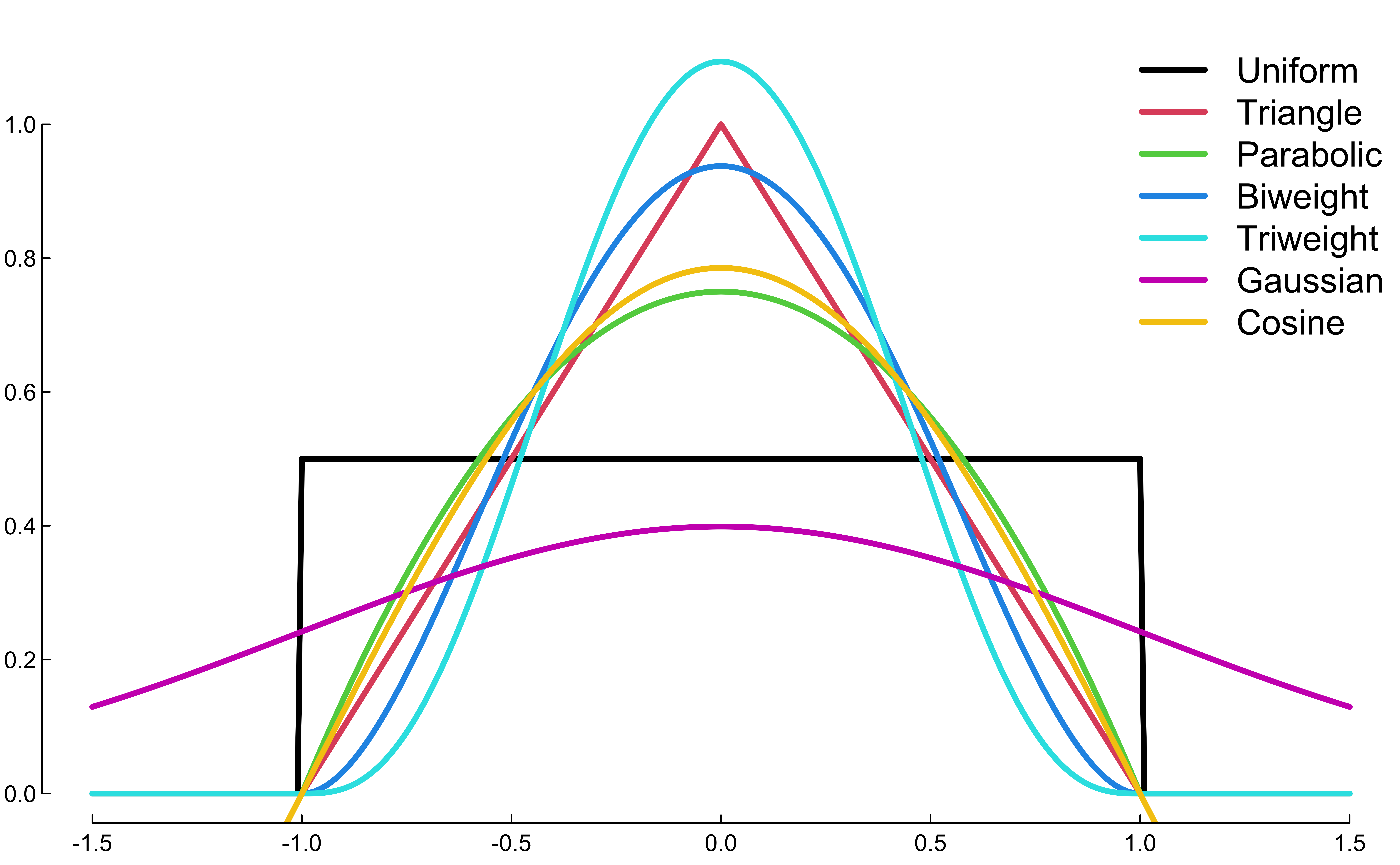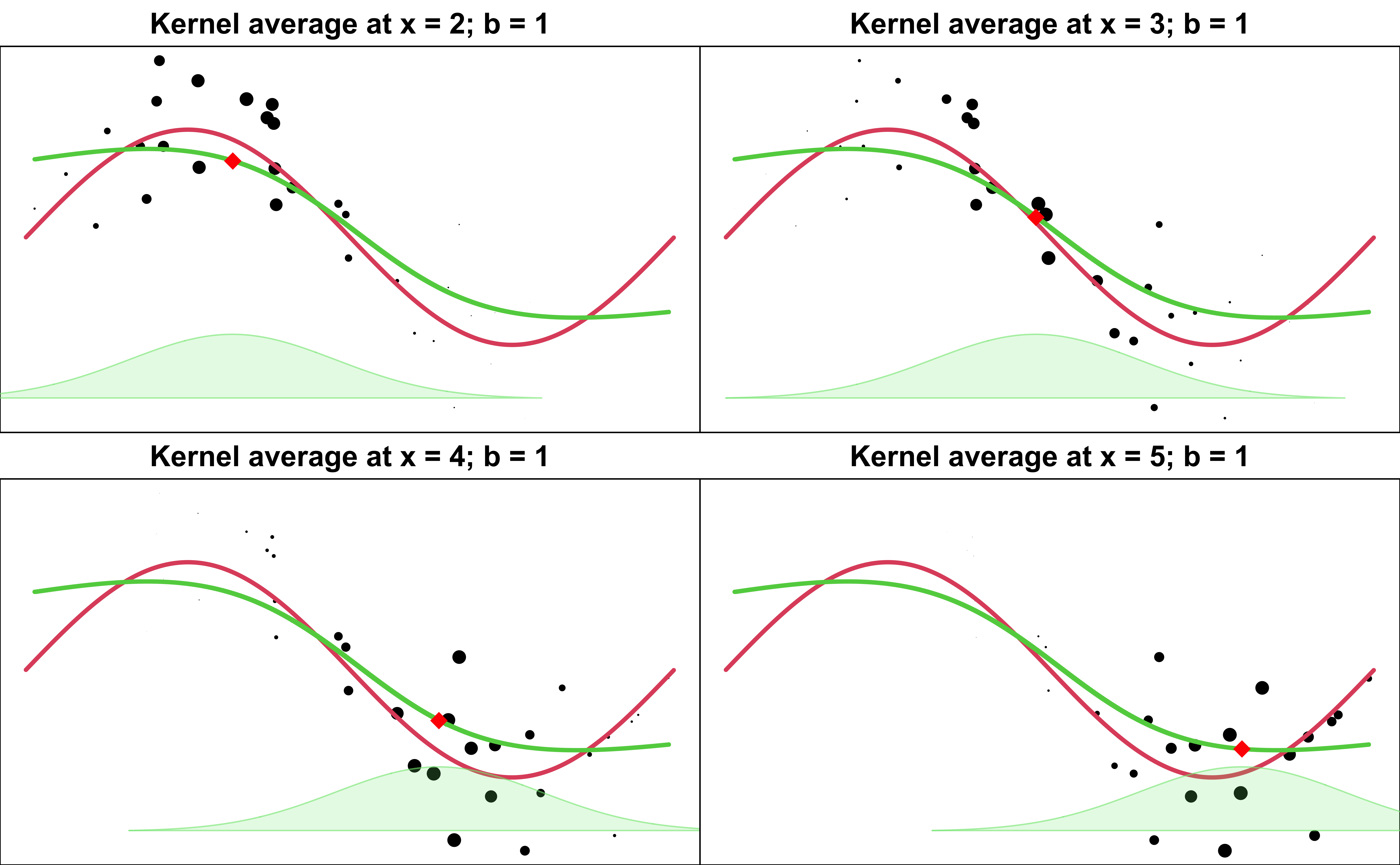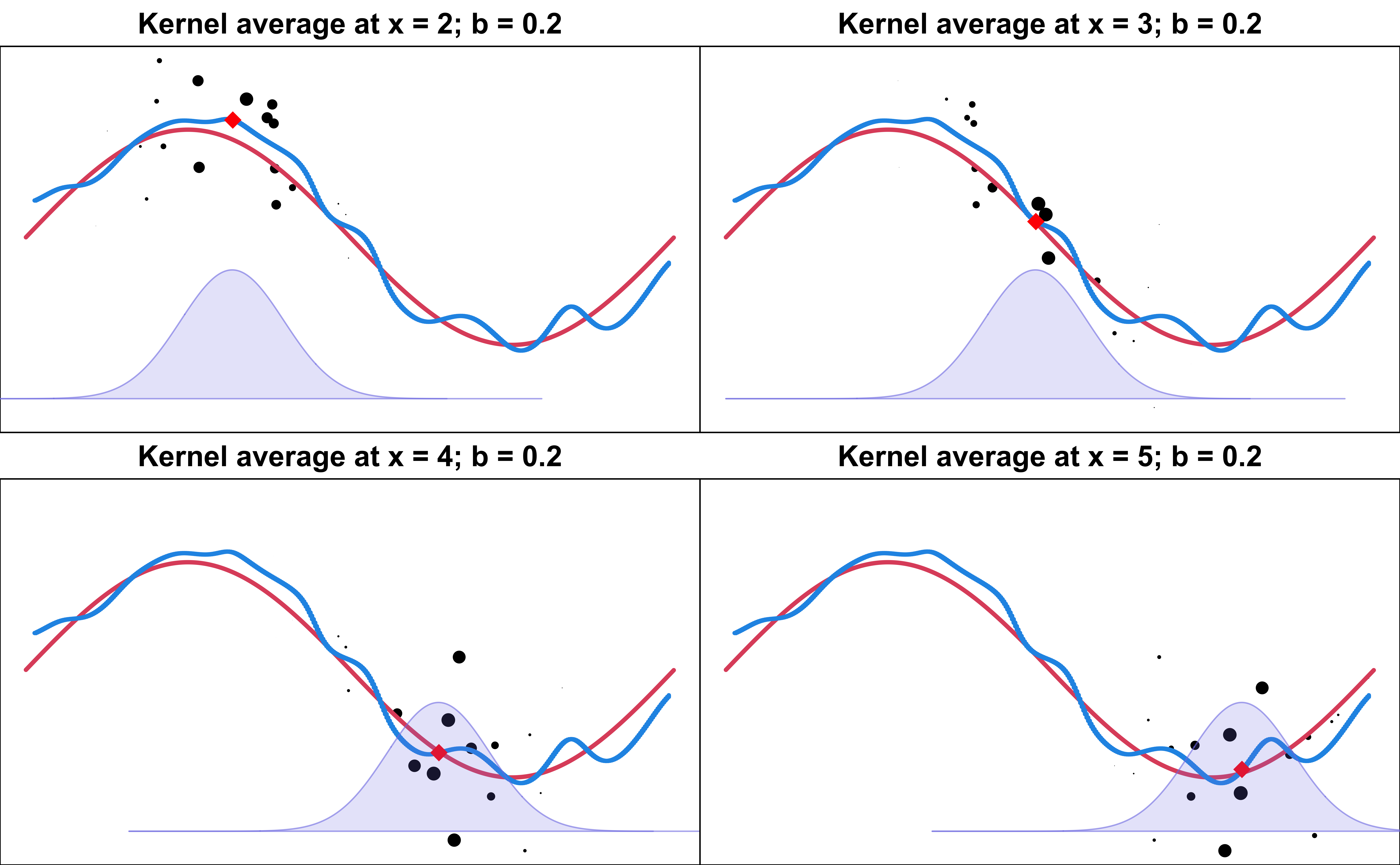 The NadarayaâWatson kernel regression uses the weights given by \[\small w_{ij} = \frac{K \left( \frac{x_i - x_j}{b}\right)}{\sum_{k=1}^nK \left( \frac{x_i - x_k}{b}\right)}\]