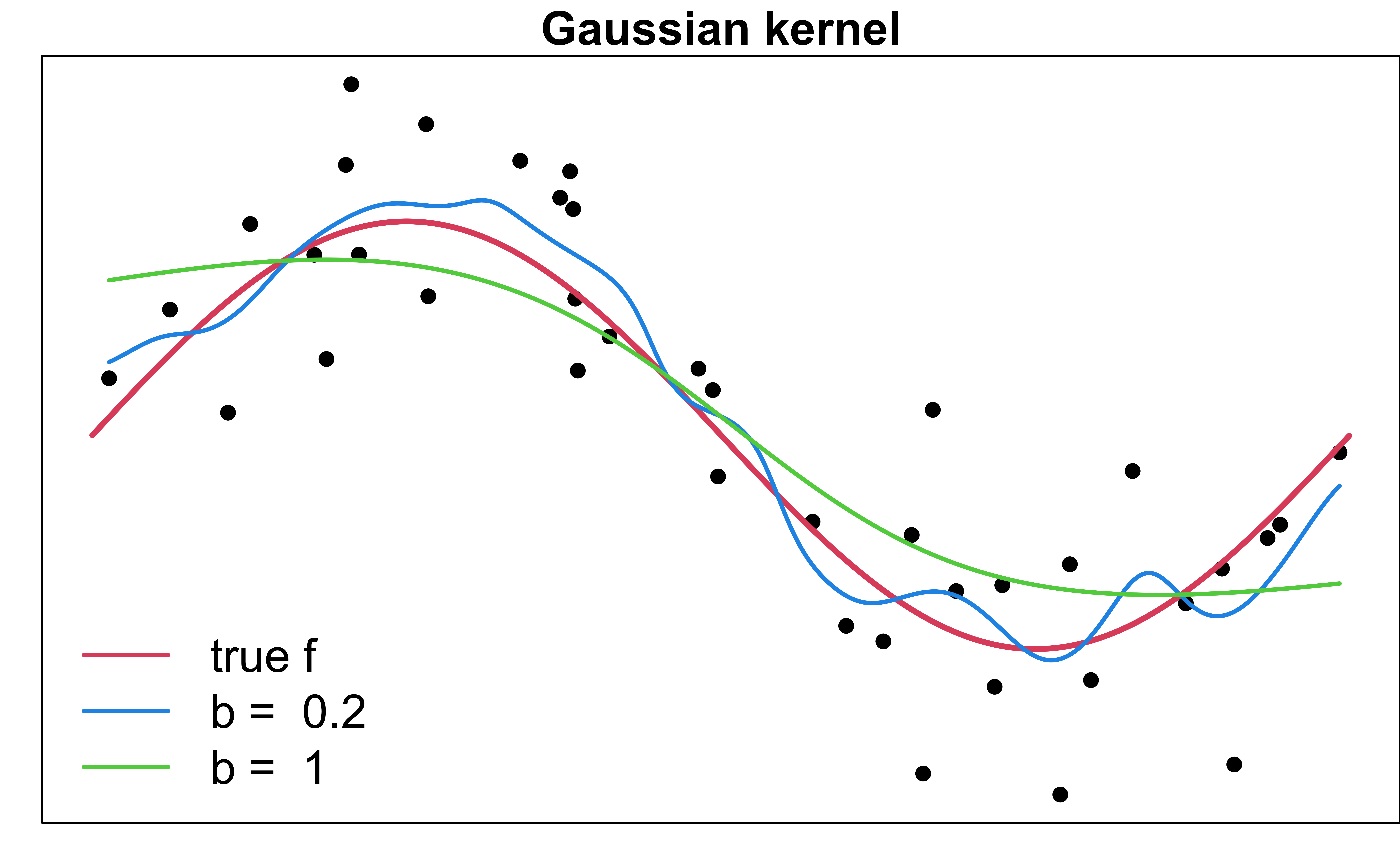 \[\small w_{ij} = \frac{K \left( \frac{x_i - x_j}{b}\right)}{\sum_{k=1}^nK \left( \frac{x_i - x_k}{b}\right)}\] Bandwidth \(b\) defines âneighborsâ of \(x_i\), and controls the smoothness of the estimated \(f\).